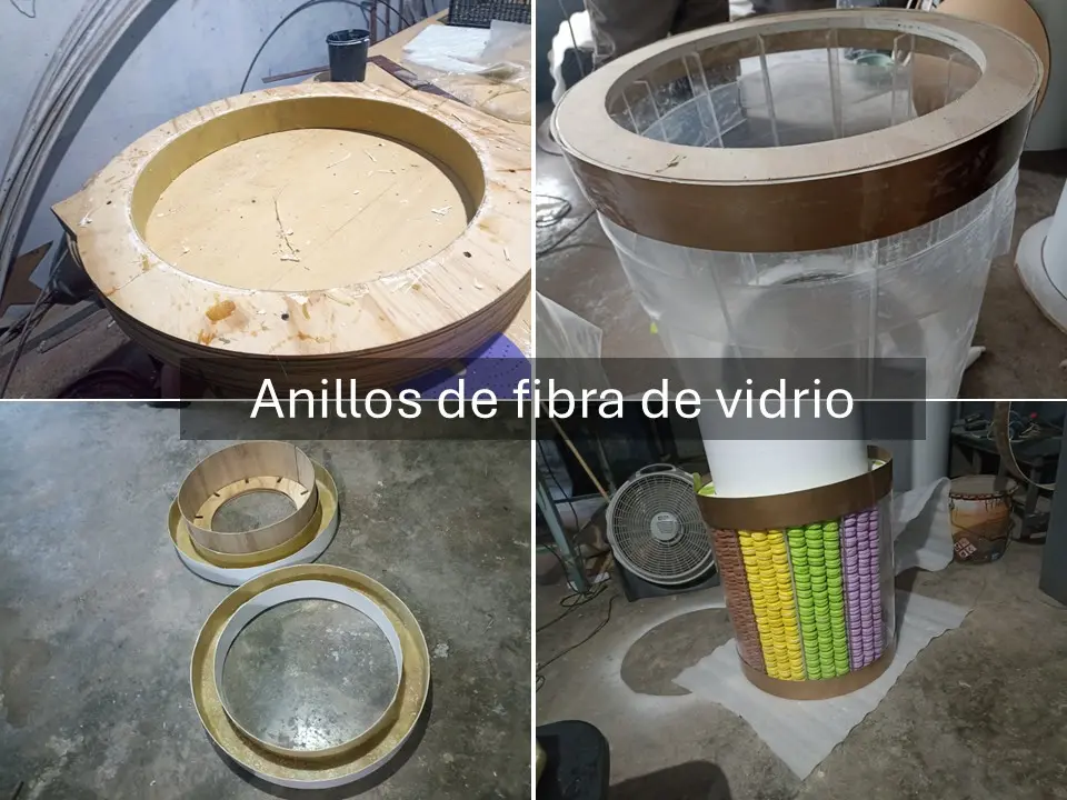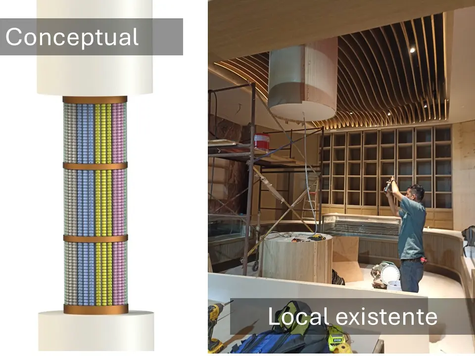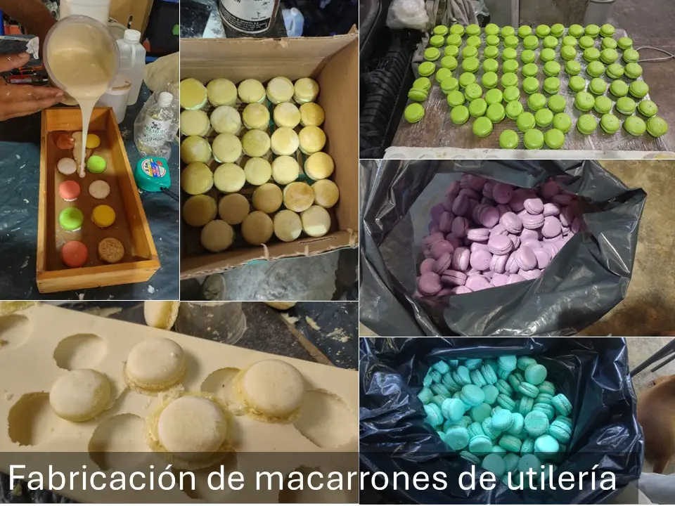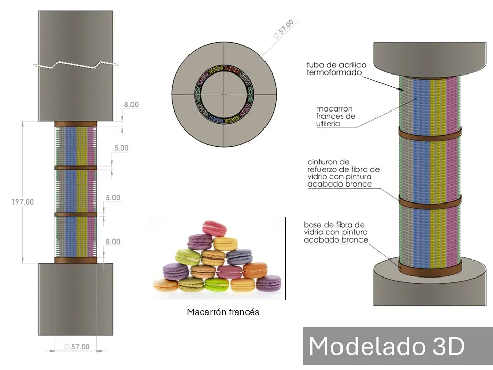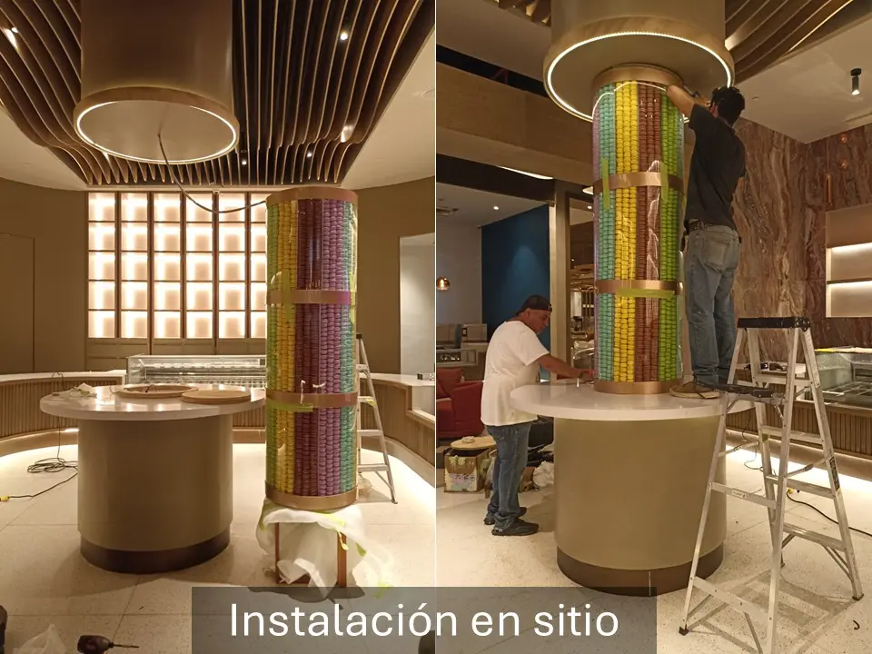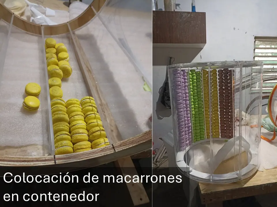 Para la elaboración del contenedor se fabricó un contenedor de acrílico transparente con secciones en fibra de vidrio con acabado en pintura metálica color cobre, se fabricaron 2500 macarrones franceses de utilería con un aspecto realista, se colocó un fondo falso en el interior del contenedor para usar solo la cantidad necesaria de macarrones logrando el aspecto deseado con la cantidad de macarrones necesaria.