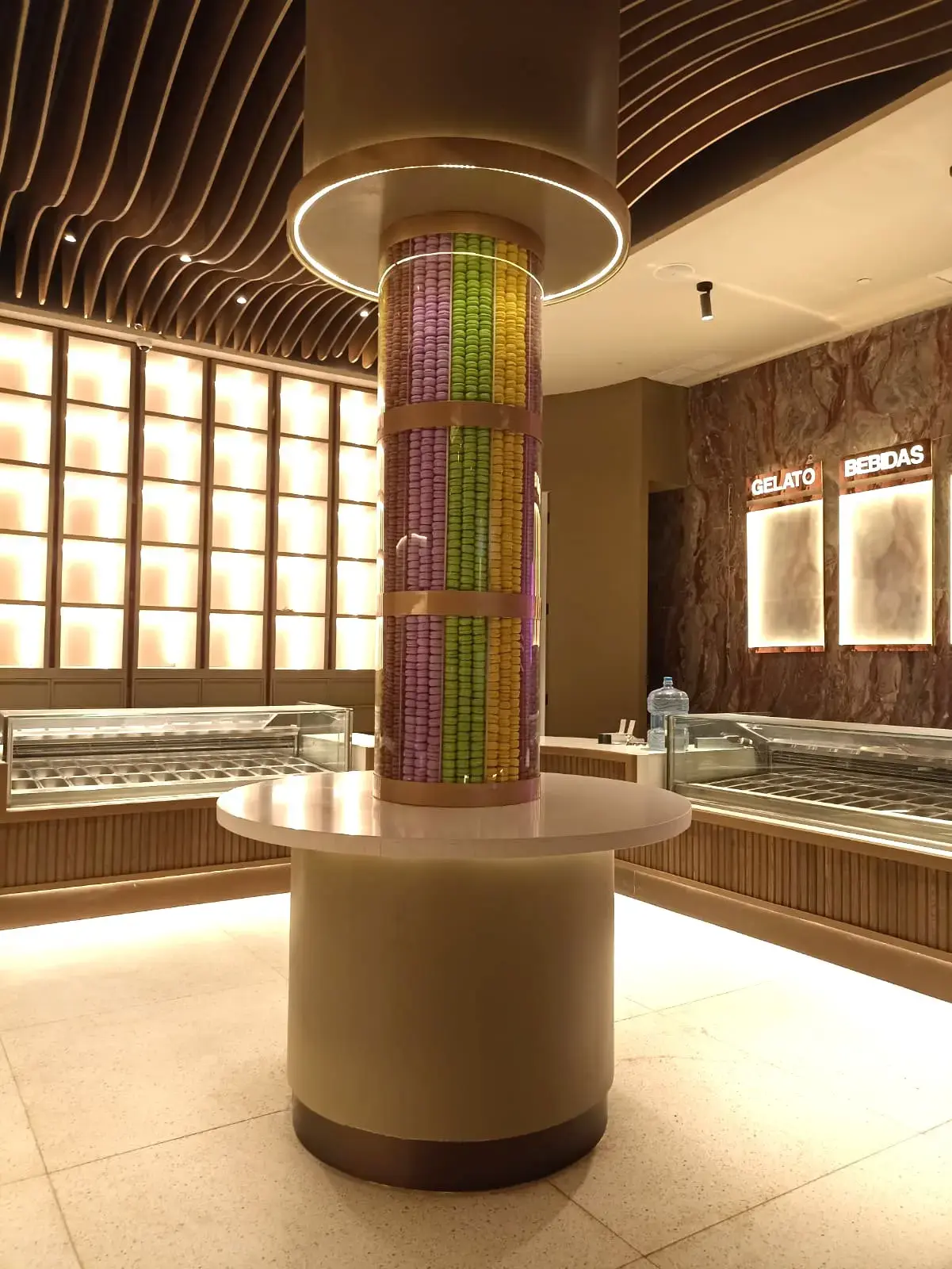 En el corredor principal del HOTEL AVA RESORT se puede encontrar la tienda de helados, en la cual los arquitectos responsables del proyecto buscaban colocar un elemento decorativo que fuera el elemento central, resultando en la idea de un contenedor de macarrones franceses que con sus colores captara la atención de los huéspedes.